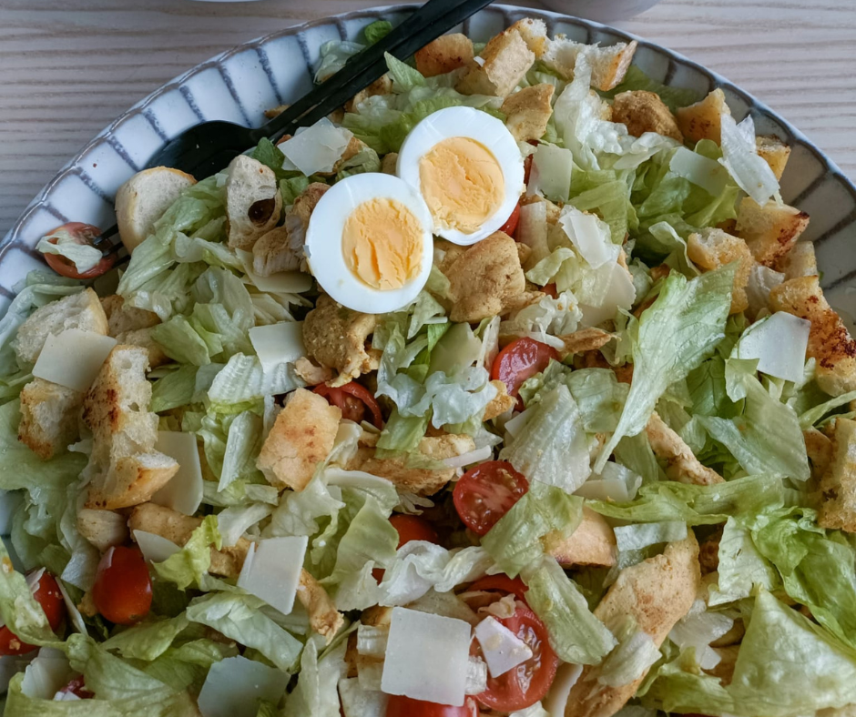 Meng de sla, tomaatjes, Grana Padano (of parmezaan) schilfers, kip, eieren en voeg naar smaak caesar dressing toe.